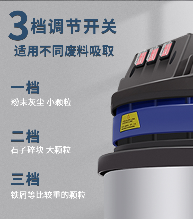 適用場所:DJ3680工業(yè)吸塵器對于工業(yè)清潔一機就能搞定,一站式解決各種工業(yè)清潔問題,可吸入多種廢料,有3檔調(diào)節(jié)開關(guān)適用不同廢料吸取,1檔粉末灰塵小顆粒,2檔石子碎塊大顆粒,三檔鐵屑等比較重的顆粒。