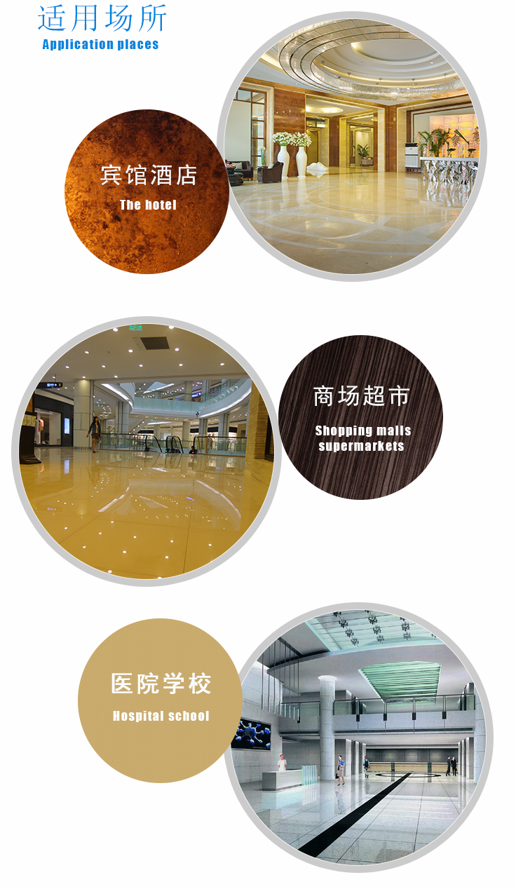 適用場(chǎng)所:能滿足各種硬質(zhì)地面清洗、起蠟、地毯護(hù)理等工作的要求,適用于賓館、酒店、通道、工礦企業(yè)等不同場(chǎng)所,是保潔公司日常保潔工作輔助產(chǎn)品。