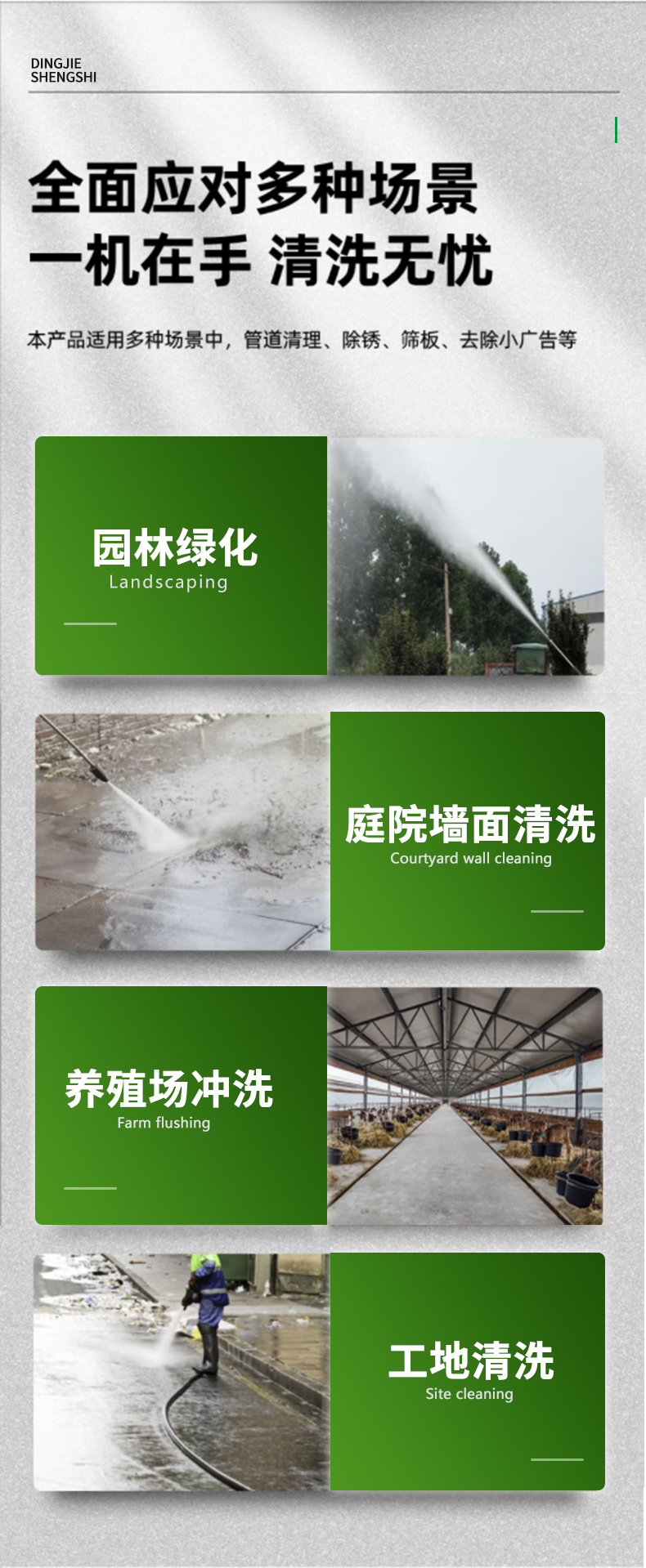 適用場所:適用場所:能有效清除建筑物,地面灰塵、污漬、可更高效的清洗環(huán)衛(wèi)站、公交車、工程車輛等,可實(shí)現(xiàn)一機(jī)多用,是城市保潔、環(huán)衛(wèi)、建筑工礦企業(yè)理想的性價(jià)比最高的戶外沖洗產(chǎn)品。